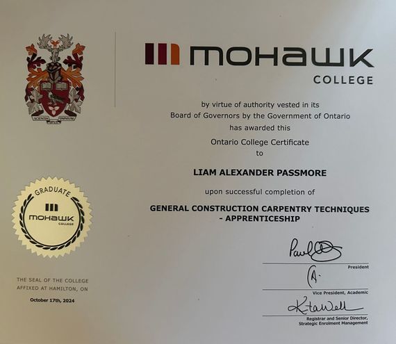 Graduated and recognized on the Dean's Honours List for Summer 2024 from the General Carpentry Apprenticeship Program at Mohawk College.